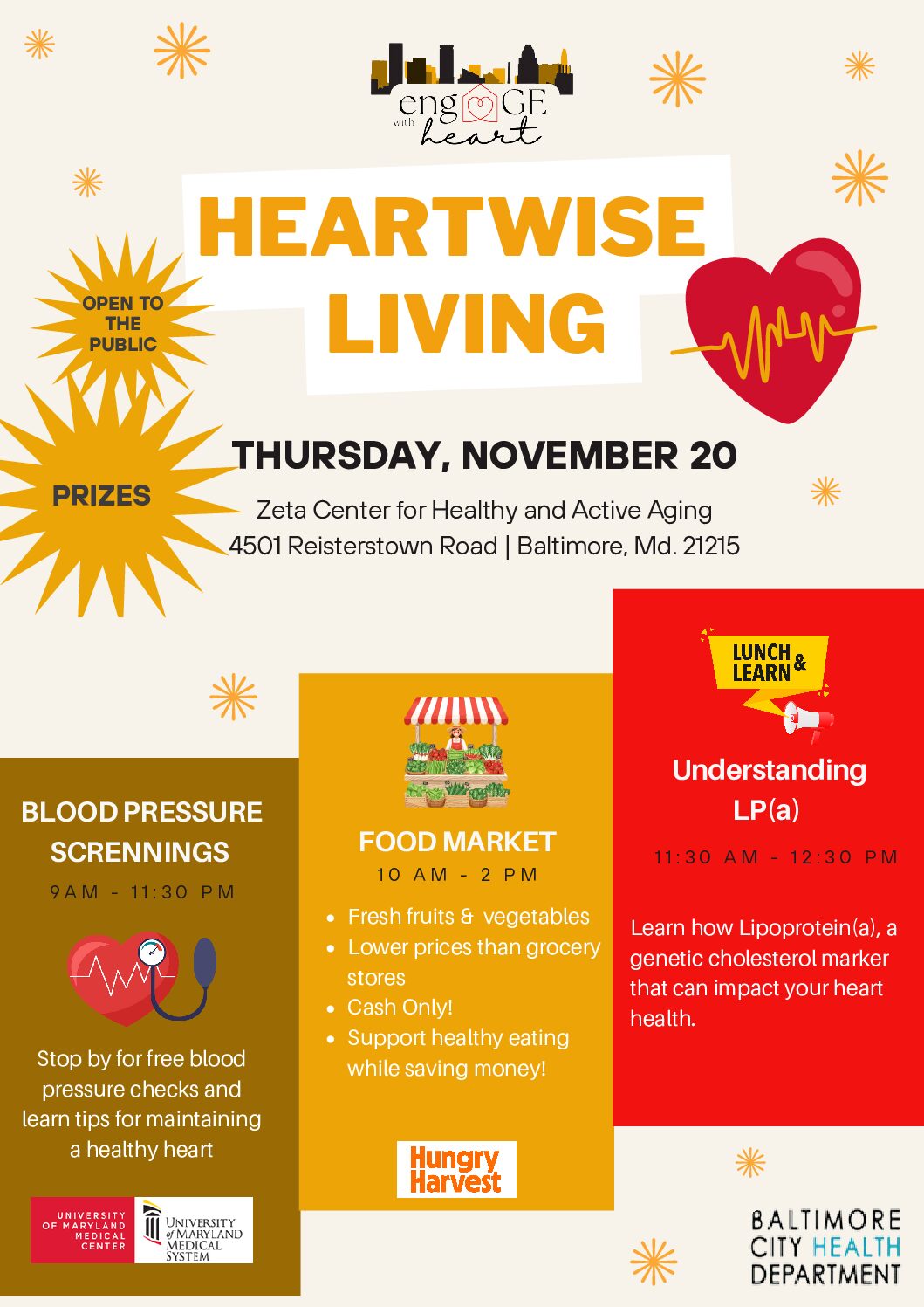 Zeta Center for Healthy Aging 4501 Reisterstown Road, BaltimoreJoin us for Heartwise Living on Thursday, November 20 at the Zeta Center for Healthy and Active Aging (4501 Reisterstown Road). This free community event will offer blood pressure screenings, access to affordable fresh produce, and a Lunch & Learn session on LP(a), a genetic cholesterol marker linked to heart health.