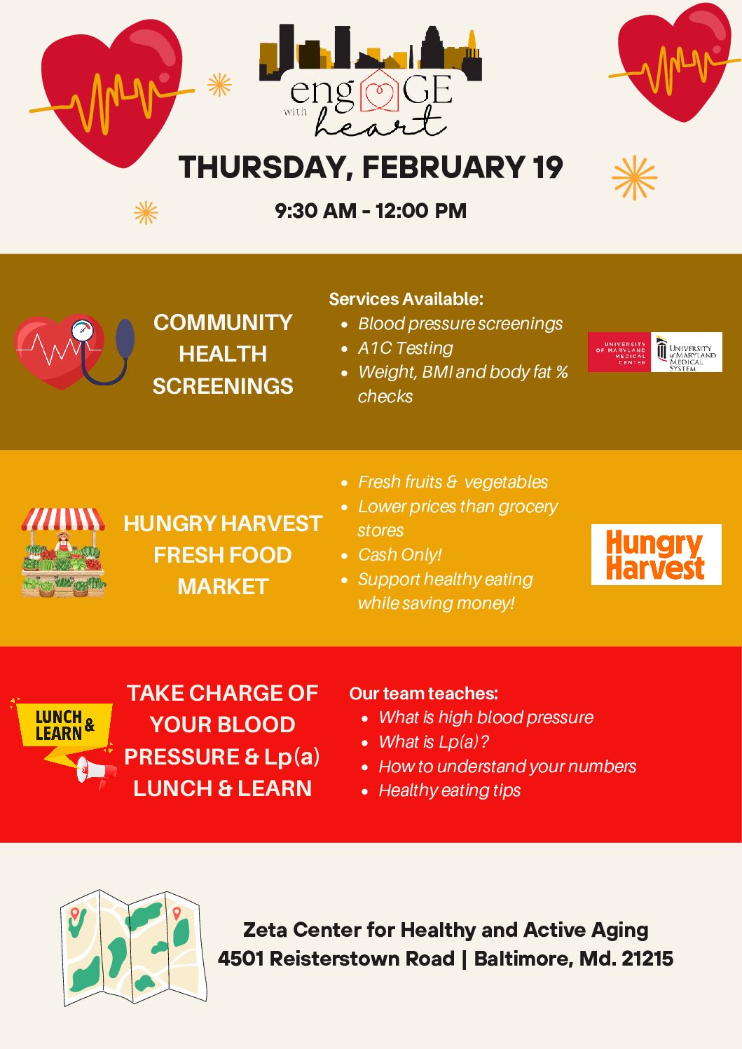 Zeta Center for Healthy Aging 4501 Reisterstown Road, Baltimore, MD, United StatesJoin us at the Zeta Center for Healthy and Active Aging for free blood pressure screenings, A1C testing, and BMI testing! Participants will be able to get screened and participate in a lunch and learn series to understand the importance of these screenings and taking control of your health. Our partner, Hungry Harvest Food Market, […]